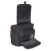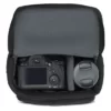 A modern, multi-equipment shoulder bag with quick access to camera and lens.