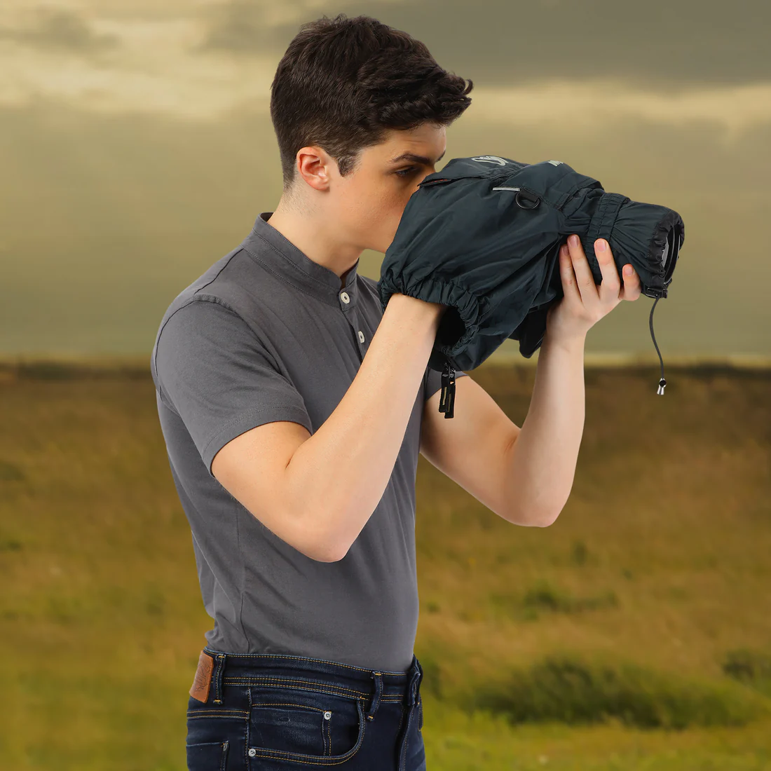 MOBIUS H2O Suraksha Camera Rain cover is the perfect support tool for wildlife photographers carrying a DSLR camera with lens. The extendable lens cover can be easily opened in this manner as per the lens required length. The Elastic closure secures the lens opener section.